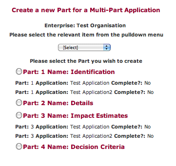 From the Main Menu, select “Create New Part for a Multi-Part Application”. On the subsequent page depicted opposite, use the pull-down menu to select the Application Name specified on registration. Click “Part 1”, and then click “Next”.