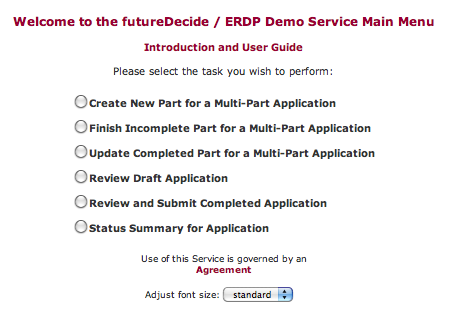 3. Entering your Application content: This section provides instructions to enable an applicant to complete a futureDecide / ERDP Demo Application. The Application consists of four parts. Each part must be completed separately. With responses prepared in advance, the entire Application including Parts 1 through 4 can normally be completed online in about 30 minutes.