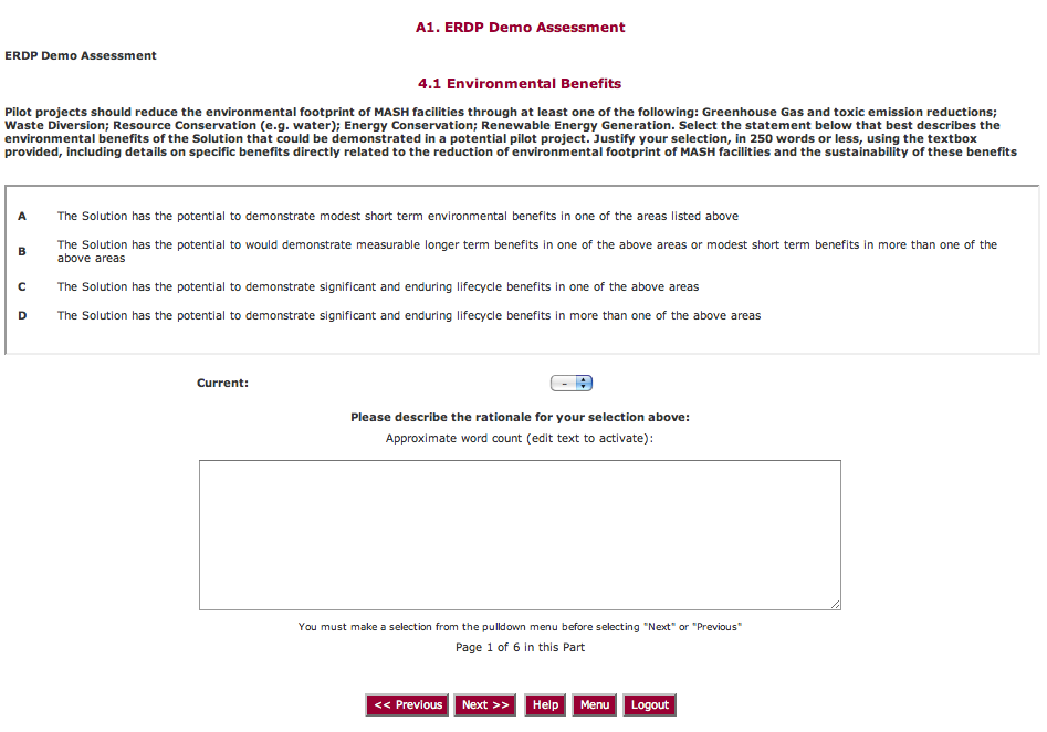 Part 4 of the Application consists of your self-assessment responses related to the Decision Criteria for the futureDecide / ERDP Demo Application. These criteria will be referred to by expert reviewers in evaluating your Application, but the reviewers will provide their own assessments against the criteria. Benchmark statements (termed a Language Ladder) for each criterion form the basis for this evaluation.