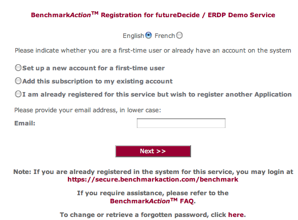 1. Registration: This section provides step-by-step instructions on registering to use the futureDecide / ERDP Demo Application Service. [Note to DEMO users: you do not need to register as you should use the testUser2 account as indicated below.]